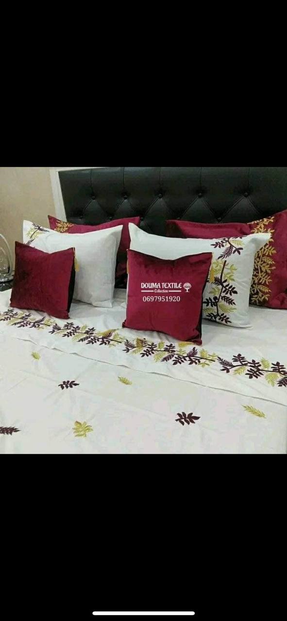 Parure de drap composé de 07 sept pièces: drap, deux coussins rectangulaire, deux coussins carrés et deux jetés